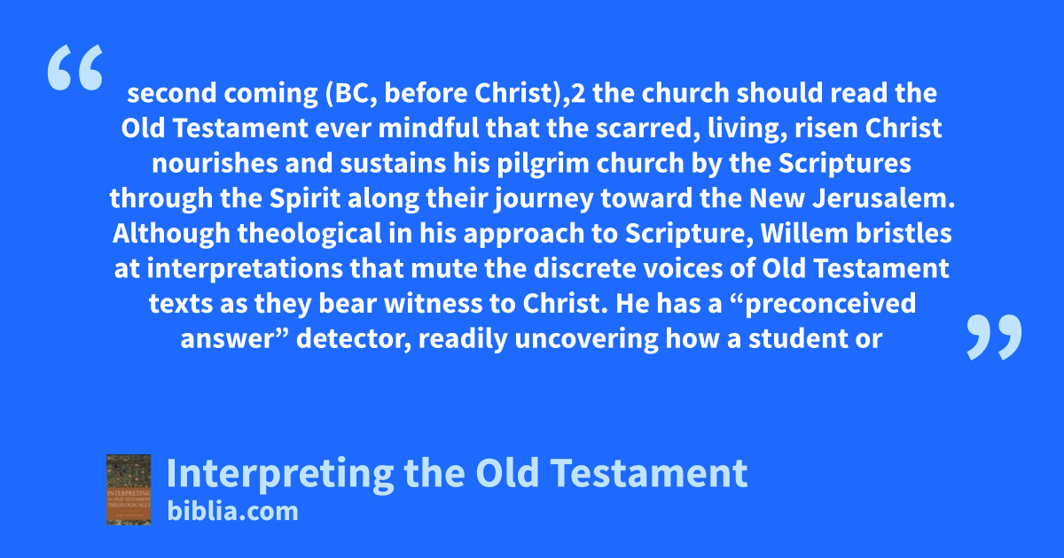 second coming (BC, before Christ),2 the church should read the Old Testament ever mindful that the scarred, living, risen Christ nourishes and sustains his pilgrim church by the Scriptures through the Spirit along their journey toward the New Jerusalem. Although theological in his approach to Scripture, Willem bristles at interpretations that mute the discrete voices of Old Testament texts as they bear witness to Christ. He has a “preconceived answer” detector, readily uncovering how a student or