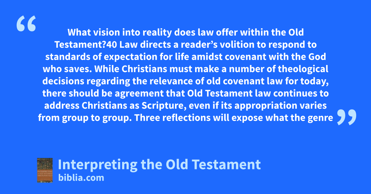 What vision into reality does law offer within the Old Testament?40 Law directs a reader’s volition to respond to standards of expectation for life amidst covenant with the God who saves. While Christians must make a number of theological decisions regarding the relevance of old covenant law for today, there should be agreement that Old Testament law continues to address Christians as Scripture, even if its appropriation varies from group to group. Three reflections will expose what the genre