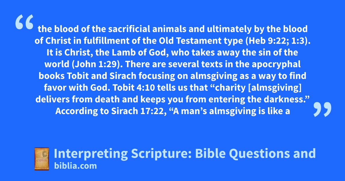 the blood of the sacrificial animals and ultimately by the blood of Christ in fulfillment of the Old Testament type (Heb 9:22; 1:3). It is Christ, the Lamb of God, who takes away the sin of the world (John 1:29). There are several texts in the apocryphal books Tobit and Sirach focusing on almsgiving as a way to find favor with God. Tobit 4:10 tells us that “charity [almsgiving] delivers from death and keeps you from entering the darkness.” According to Sirach 17:22, “A man’s almsgiving is like a