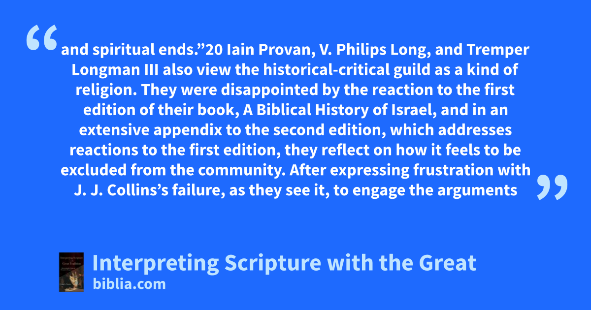 and spiritual ends.”20 Iain Provan, V. Philips Long, and Tremper Longman III also view the historical-critical guild as a kind of religion. They were disappointed by the reaction to the first edition of their book, A Biblical History of Israel, and in an extensive appendix to the second edition, which addresses reactions to the first edition, they reflect on how it feels to be excluded from the community. After expressing frustration with J. J. Collins’s failure, as they see it, to engage the arguments