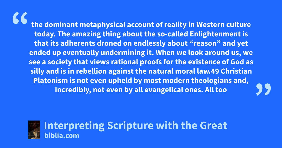 the dominant metaphysical account of reality in Western culture today. The amazing thing about the so-called Enlightenment is that its adherents droned on endlessly about “reason” and yet ended up eventually undermining it. When we look around us, we see a society that views rational proofs for the existence of God as silly and is in rebellion against the natural moral law.49 Christian Platonism is not even upheld by most modern theologians and, incredibly, not even by all evangelical ones. All too