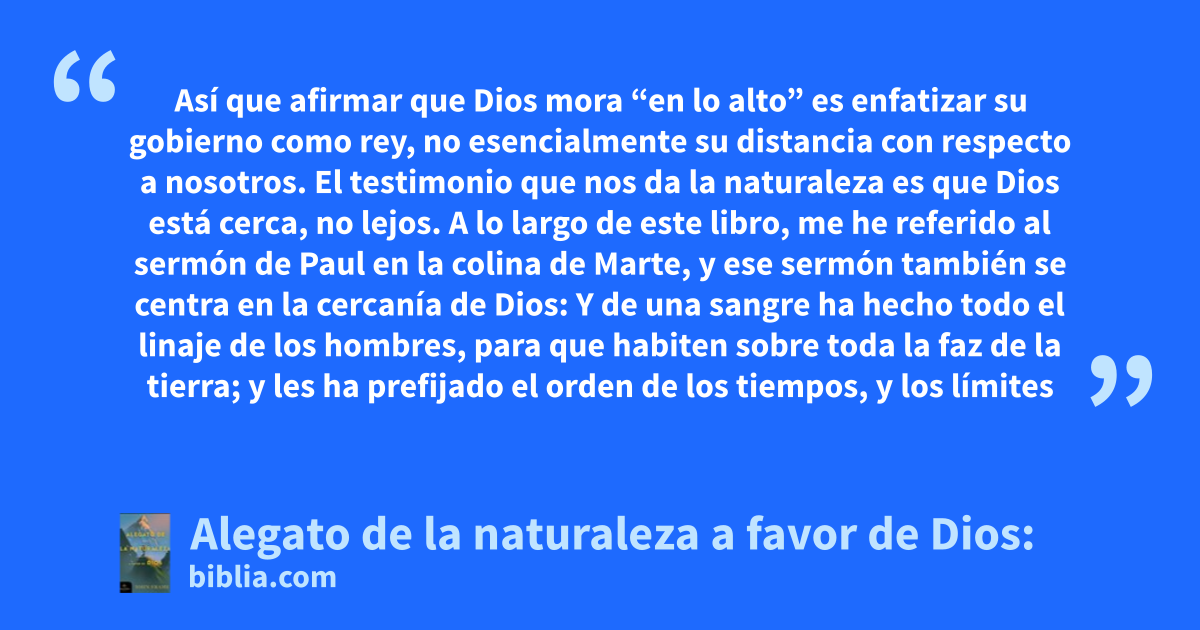 Así que afirmar que Dios mora “en lo alto” es enfatizar su gobierno como rey, no esencialmente su distancia con respecto a nosotros. El testimonio que nos da la naturaleza es que Dios está cerca, no lejos. A lo largo de este libro, me he referido al sermón de Paul en la colina de Marte, y ese sermón también se centra en la cercanía de Dios: Y de una sangre ha hecho todo el linaje de los hombres, para que habiten sobre toda la faz de la tierra; y les ha prefijado el orden de los tiempos, y los límites