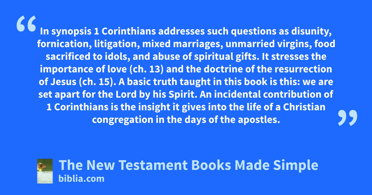 In synopsis 1 Corinthians addresses such questions as disunity, fornication, litigation, mixed marriages, unmarried virgins, food sacrificed to idols, and abuse of spiritual gifts. It stresses the importance of love (ch. 13) and the doctrine of the resurrection of Jesus (ch. 15). A basic truth taught in this book is this: we are set apart for the Lord by his Spirit. An incidental contribution of 1 Corinthians is the insight it gives into the life of a Christian congregation in the days of the apostles.
