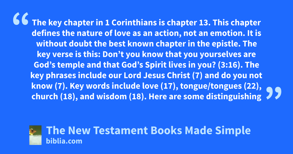 The key chapter in 1 Corinthians is chapter 13. This chapter defines the nature of love as an action, not an emotion. It is without doubt the best known chapter in the epistle. The key verse is this: Don’t you know that you yourselves are God’s temple and that God’s Spirit lives in you? (3:16). The key phrases include our Lord Jesus Christ (7) and do you not know (7). Key words include love (17), tongue/tongues (22), church (18), and wisdom (18). Here are some distinguishing