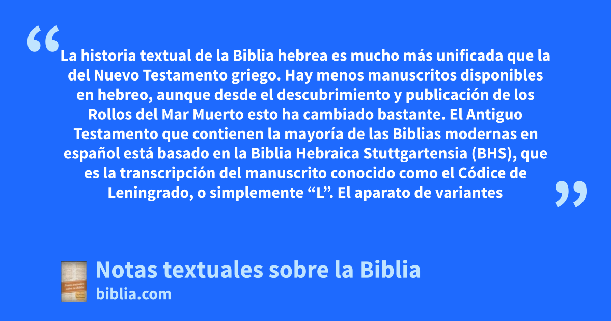 La historia textual de la Biblia hebrea es mucho más unificada que la del Nuevo Testamento griego. Hay menos manuscritos disponibles en hebreo, aunque desde el descubrimiento y publicación de los Rollos del Mar Muerto esto ha cambiado bastante. El Antiguo Testamento que contienen la mayoría de las Biblias modernas en español está basado en la Biblia Hebraica Stuttgartensia (BHS), que es la transcripción del manuscrito conocido como el Códice de Leningrado, o simplemente “L”. El aparato de variantes