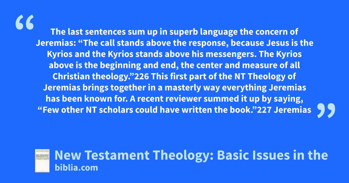 The last sentences sum up in superb language the concern of Jeremias: “The call stands above the response, because Jesus is the Kyrios and the Kyrios stands above his messengers. The Kyrios above is the beginning and end, the center and measure of all Christian theology.”226 This first part of the NT Theology of Jeremias brings together in a masterly way everything Jeremias has been known for. A recent reviewer summed it up by saying, “Few other NT scholars could have written the book.”227 Jeremias