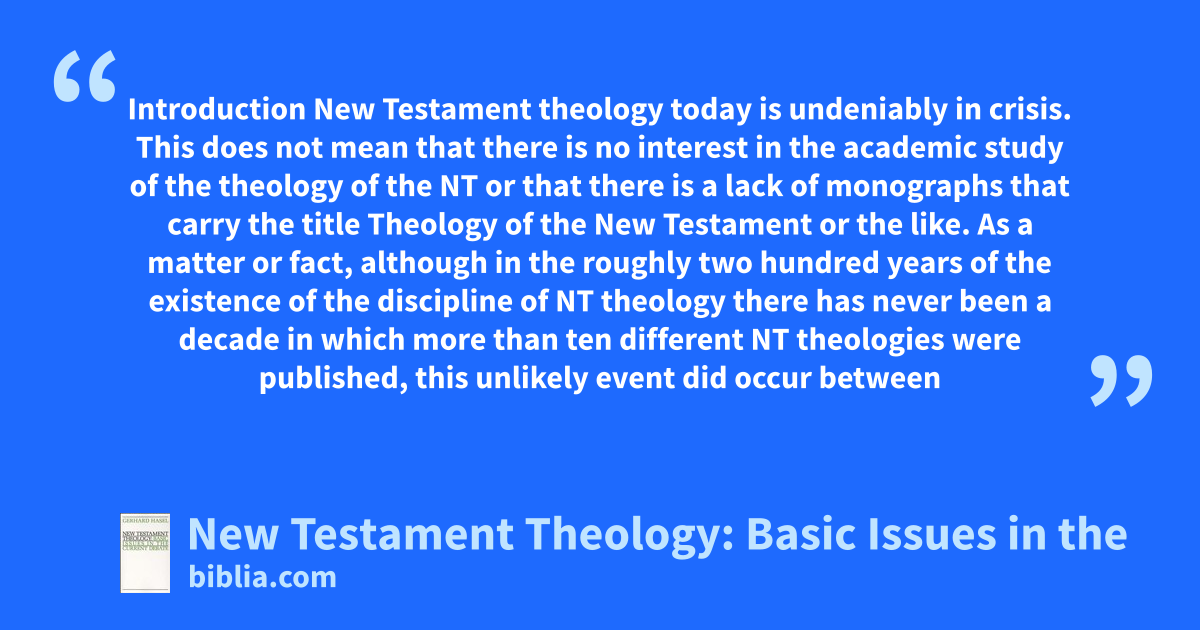 Introduction New Testament theology today is undeniably in crisis. This does not mean that there is no interest in the academic study of the theology of the NT or that there is a lack of monographs that carry the title Theology of the New Testament or the like. As a matter or fact, although in the roughly two hundred years of the existence of the discipline of NT theology there has never been a decade in which more than ten different NT theologies were published, this unlikely event did occur between