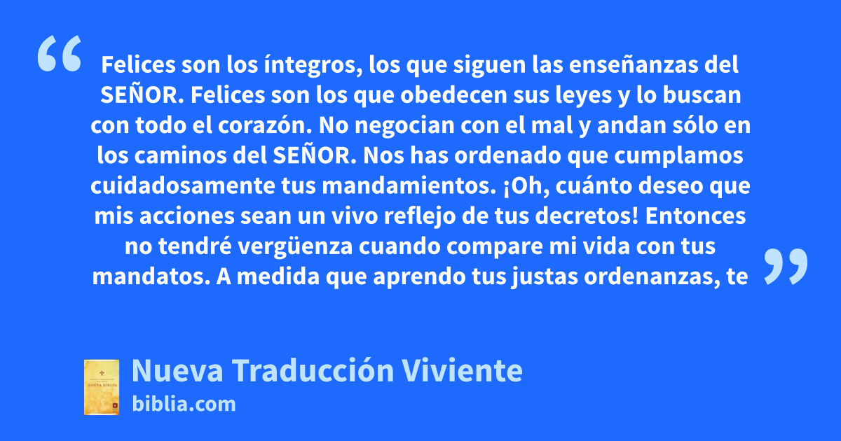 Felices son los íntegros, los que siguen las enseñanzas del SEÑOR. Felices son los que obedecen sus leyes y lo buscan con todo el corazón. No negocian con el mal y andan sólo en los caminos del SEÑOR. Nos has ordenado que cumplamos cuidadosamente tus mandamientos. ¡Oh, cuánto deseo que mis acciones sean un vivo reflejo de tus decretos! Entonces no tendré vergüenza cuando compare mi vida con tus mandatos. A medida que aprendo tus justas ordenanzas, te