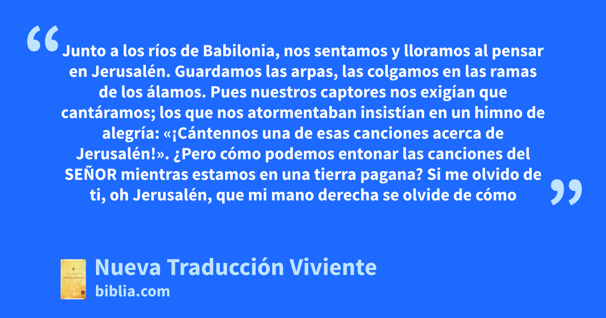 Junto a los ríos de Babilonia, nos sentamos y lloramos al pensar en Jerusalén. Guardamos las arpas, las colgamos en las ramas de los álamos. Pues nuestros captores nos exigían que cantáramos; los que nos atormentaban insistían en un himno de alegría: «¡Cántennos una de esas canciones acerca de Jerusalén!». ¿Pero cómo podemos entonar las canciones del SEÑOR mientras estamos en una tierra pagana? Si me olvido de ti, oh Jerusalén, que mi mano derecha se olvide de cómo