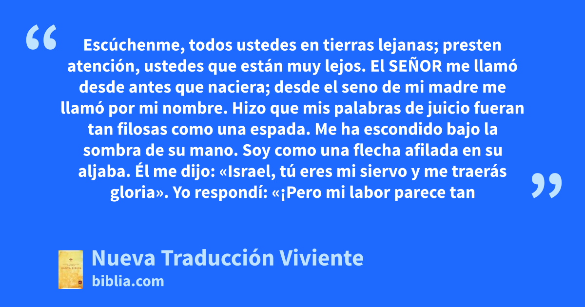 Escúchenme, todos ustedes en tierras lejanas; presten atención, ustedes que están muy lejos. El SEÑOR me llamó desde antes que naciera; desde el seno de mi madre me llamó por mi nombre. Hizo que mis palabras de juicio fueran tan filosas como una espada. Me ha escondido bajo la sombra de su mano. Soy como una flecha afilada en su aljaba. Él me dijo: «Israel, tú eres mi siervo y me traerás gloria». Yo respondí: «¡Pero mi labor parece tan