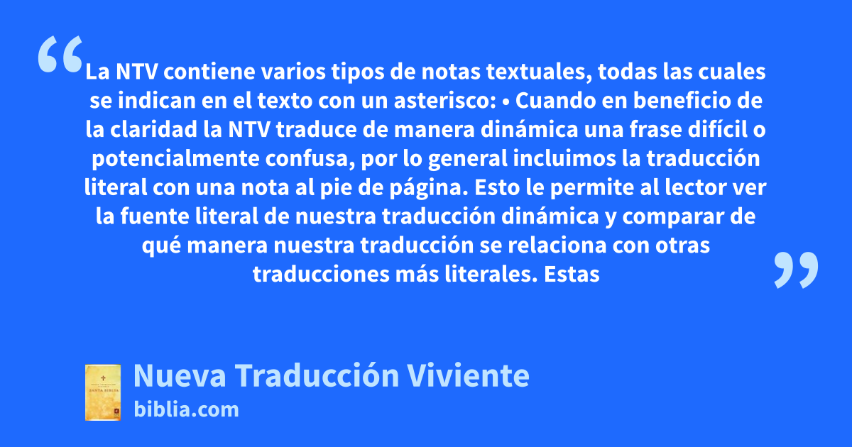 La NTV contiene varios tipos de notas textuales, todas las cuales se indican en el texto con un asterisco: • Cuando en beneficio de la claridad la NTV traduce de manera dinámica una frase difícil o potencialmente confusa, por lo general incluimos la traducción literal con una nota al pie de página. Esto le permite al lector ver la fuente literal de nuestra traducción dinámica y comparar de qué manera nuestra traducción se relaciona con otras traducciones más literales. Estas