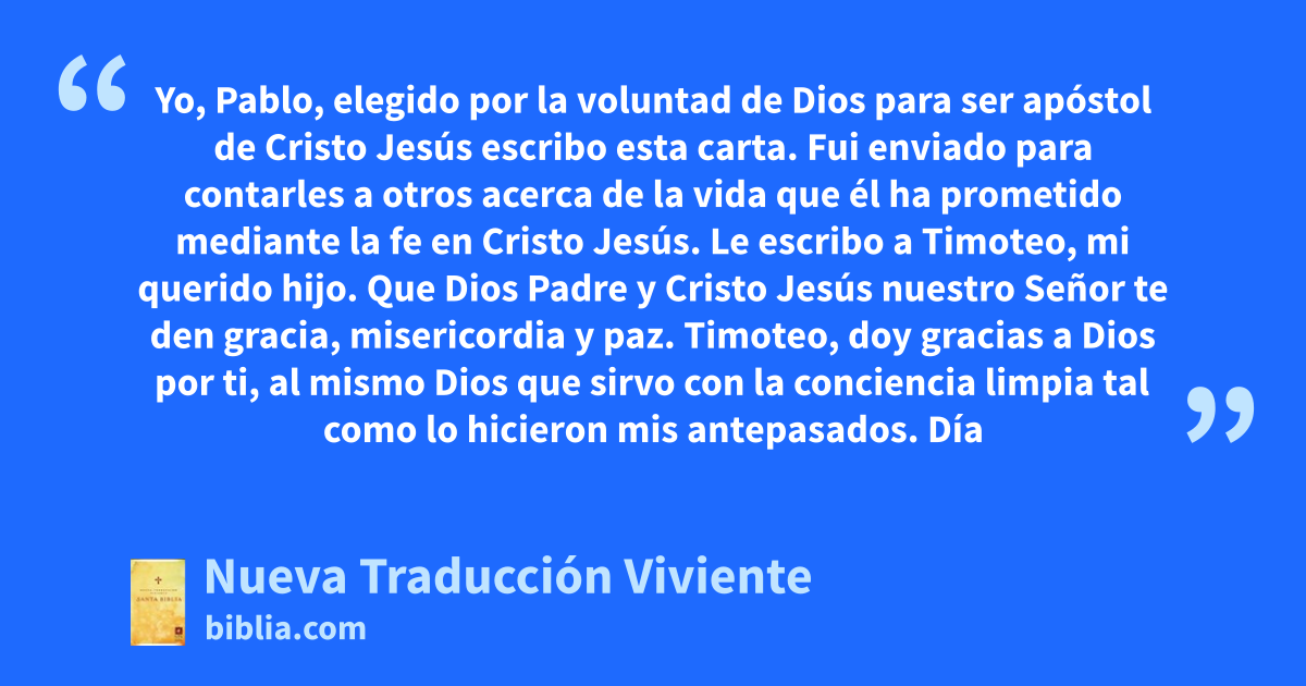 Yo, Pablo, elegido por la voluntad de Dios para ser apóstol de Cristo Jesús escribo esta carta. Fui enviado para contarles a otros acerca de la vida que él ha prometido mediante la fe en Cristo Jesús. Le escribo a Timoteo, mi querido hijo. Que Dios Padre y Cristo Jesús nuestro Señor te den gracia, misericordia y paz. Timoteo, doy gracias a Dios por ti, al mismo Dios que sirvo con la conciencia limpia tal como lo hicieron mis antepasados. Día