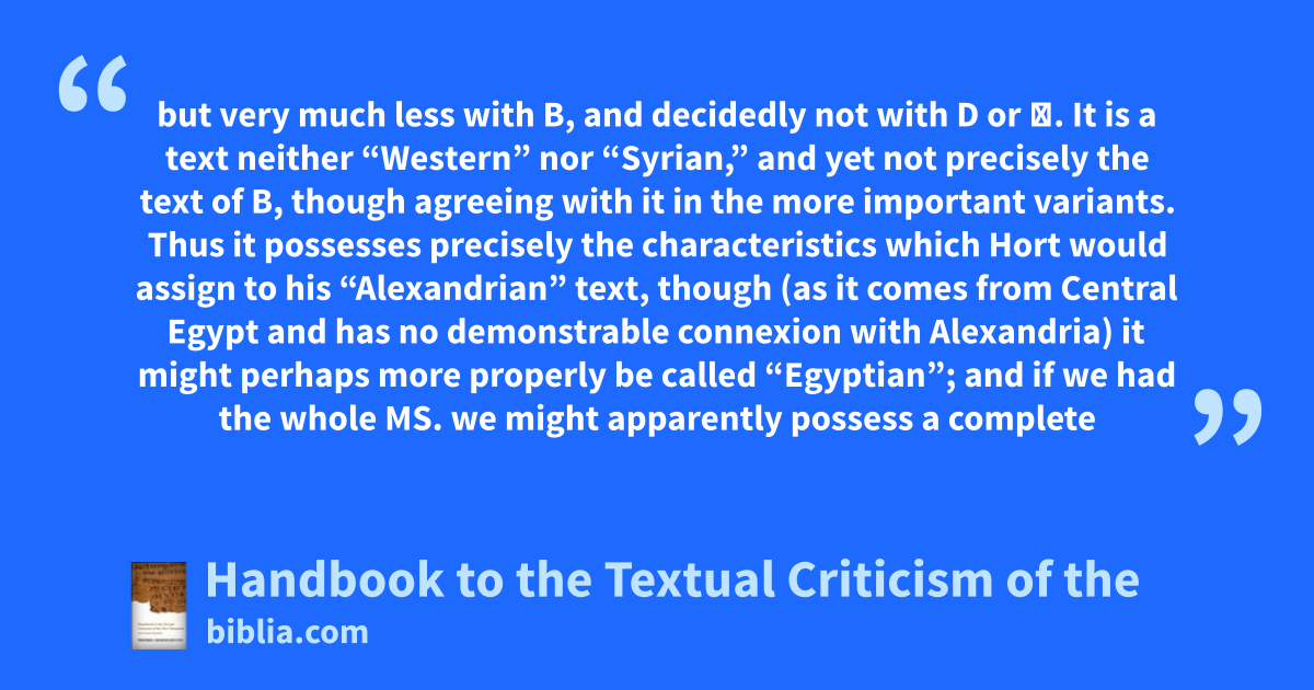 but very much less with B, and decidedly not with D or א. It is a text neither “Western” nor “Syrian,” and yet not precisely the text of B, though agreeing with it in the more important variants. Thus it possesses precisely the characteristics which Hort would assign to his “Alexandrian” text, though (as it comes from Central Egypt and has no demonstrable connexion with Alexandria) it might perhaps more properly be called “Egyptian”; and if we had the whole MS. we might apparently possess a complete