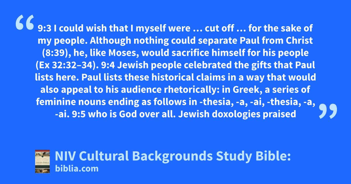 9:3 I could wish that I myself were … cut off … for the sake of my people. Although nothing could separate Paul from Christ (8:39), he, like Moses, would sacrifice himself for his people (Ex 32:32–34). 9:4 Jewish people celebrated the gifts that Paul lists here. Paul lists these historical claims in a way that would also appeal to his audience rhetorically: in Greek, a series of feminine nouns ending as follows in -thesia, -a, -ai, -thesia, -a, -ai. 9:5 who is God over all. Jewish doxologies praised