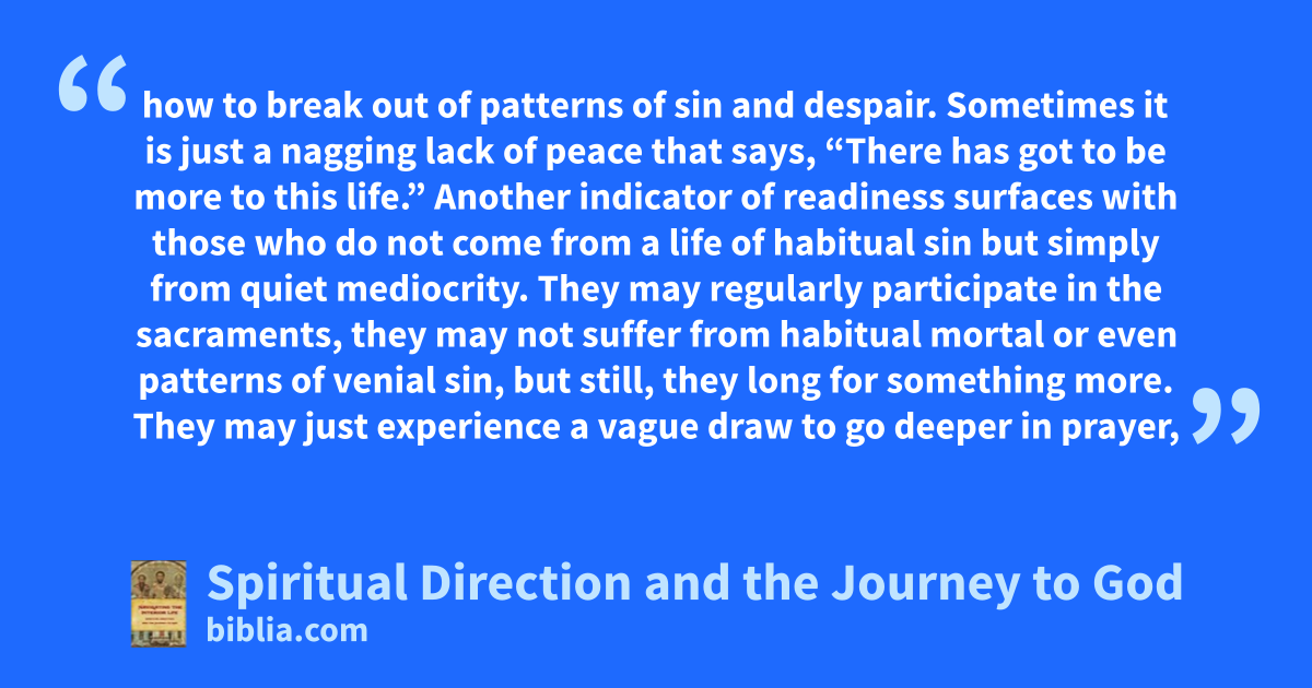 how to break out of patterns of sin and despair. Sometimes it is just a nagging lack of peace that says, “There has got to be more to this life.” Another indicator of readiness surfaces with those who do not come from a life of habitual sin but simply from quiet mediocrity. They may regularly participate in the sacraments, they may not suffer from habitual mortal or even patterns of venial sin, but still, they long for something more. They may just experience a vague draw to go deeper in prayer,