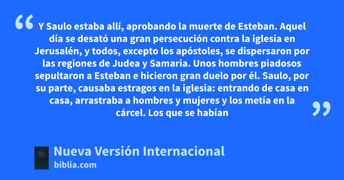Y Saulo estaba allí, aprobando la muerte de Esteban. Aquel día se desató una gran persecución contra la iglesia en Jerusalén, y todos, excepto los apóstoles, se dispersaron por las regiones de Judea y Samaria. Unos hombres piadosos sepultaron a Esteban e hicieron gran duelo por él. Saulo, por su parte, causaba estragos en la iglesia: entrando de casa en casa, arrastraba a hombres y mujeres y los metía en la cárcel. Los que se habían