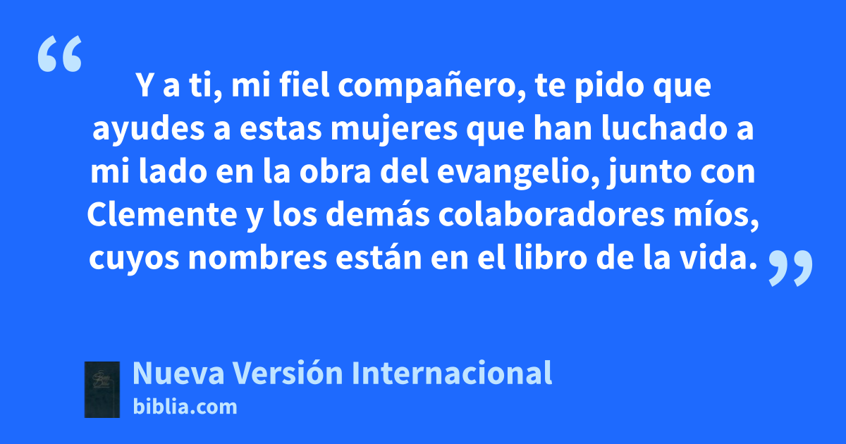 Y a ti, mi fiel compañero, te pido que ayudes a estas mujeres que han luchado a mi lado en la obra del evangelio, junto con Clemente y los demás colaboradores míos, cuyos nombres están en el libro de la vida.