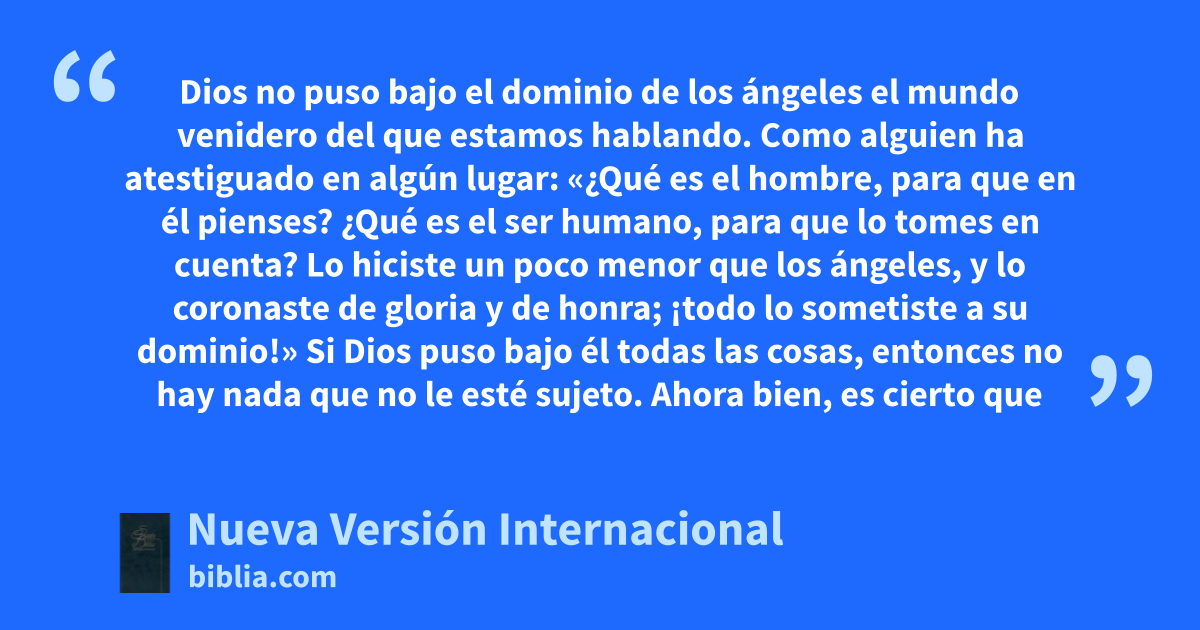 Dios no puso bajo el dominio de los ángeles el mundo venidero del que estamos hablando. Como alguien ha atestiguado en algún lugar: «¿Qué es el hombre, para que en él pienses? ¿Qué es el ser humano, para que lo tomes en cuenta? Lo hiciste un poco menor que los ángeles, y lo coronaste de gloria y de honra; ¡todo lo sometiste a su dominio!» Si Dios puso bajo él todas las cosas, entonces no hay nada que no le esté sujeto. Ahora bien, es cierto que