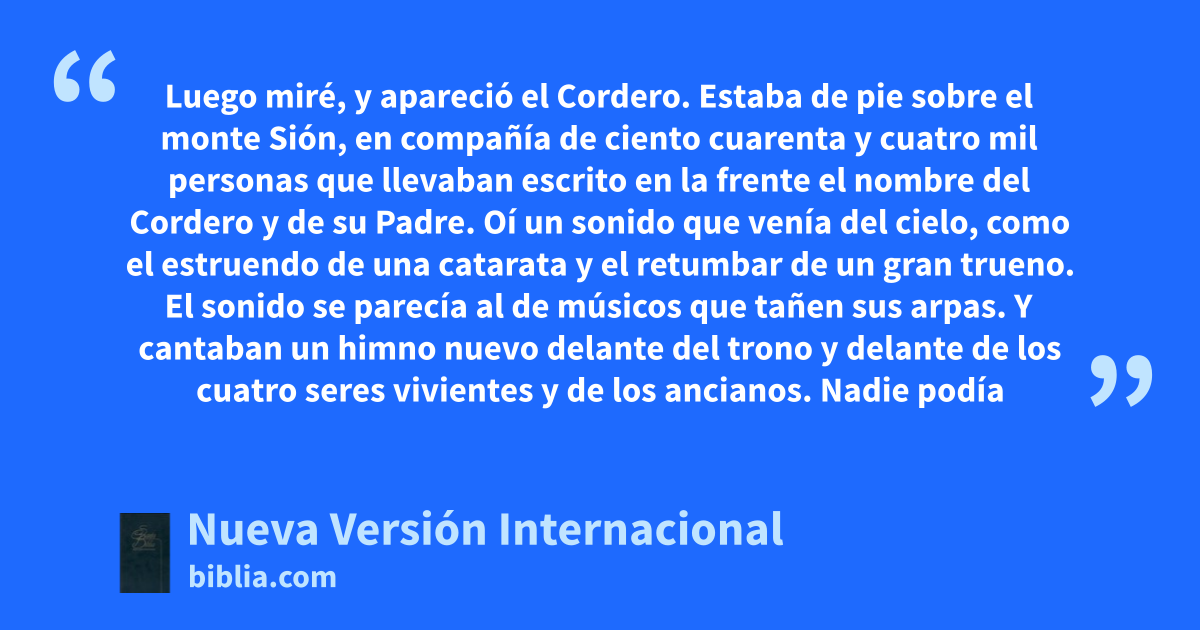 Luego miré, y apareció el Cordero. Estaba de pie sobre el monte Sión, en compañía de ciento cuarenta y cuatro mil personas que llevaban escrito en la frente el nombre del Cordero y de su Padre. Oí un sonido que venía del cielo, como el estruendo de una catarata y el retumbar de un gran trueno. El sonido se parecía al de músicos que tañen sus arpas. Y cantaban un himno nuevo delante del trono y delante de los cuatro seres vivientes y de los ancianos. Nadie podía