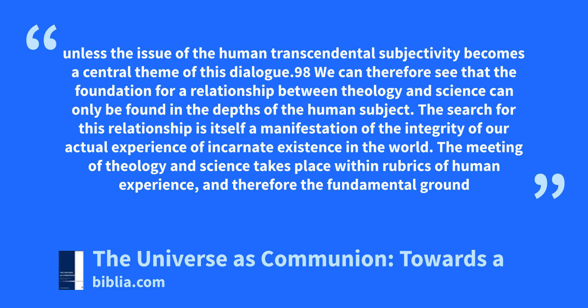 unless the issue of the human transcendental subjectivity becomes a central theme of this dialogue.98 We can therefore see that the foundation for a relationship between theology and science can only be found in the depths of the human subject. The search for this relationship is itself a manifestation of the integrity of our actual experience of incarnate existence in the world. The meeting of theology and science takes place within rubrics of human experience, and therefore the fundamental ground