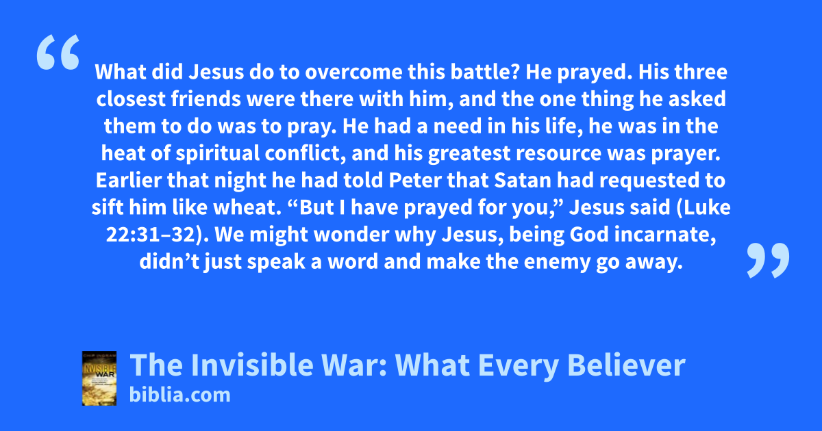 What did Jesus do to overcome this battle? He prayed. His three closest friends were there with him, and the one thing he asked them to do was to pray. He had a need in his life, he was in the heat of spiritual conflict, and his greatest resource was prayer. Earlier that night he had told Peter that Satan had requested to sift him like wheat. “But I have prayed for you,” Jesus said (Luke 22:31–32). We might wonder why Jesus, being God incarnate, didn’t just speak a word and make the enemy go away.