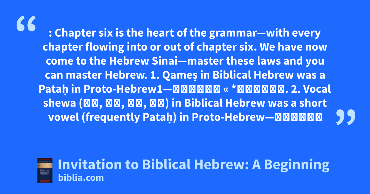 : Chapter six is the heart of the grammar—with every chapter flowing into or out of chapter six. We have now come to the Hebrew Sinai—master these laws and you can master Hebrew. 1. Qameṣ in Biblical Hebrew was a Pataḥ in Proto-Hebrew1—דָּבָר « *דַּבַר. 2. Vocal shewa (□ְ, □ֲ, □ֱ, □ֳ) in Biblical Hebrew was a short vowel (frequently Pataḥ) in Proto-Hebrew—דְּבַר