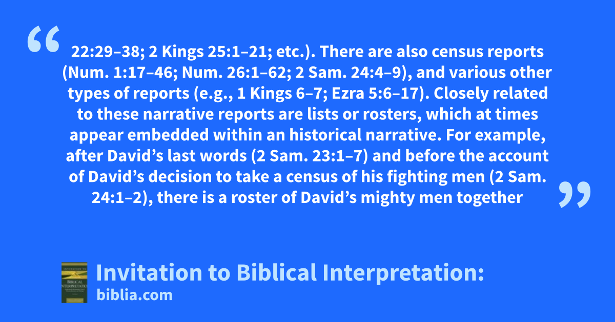 22:29–38; 2 Kings 25:1–21; etc.). There are also census reports (Num. 1:17–46; Num. 26:1–62; 2 Sam. 24:4–9), and various other types of reports (e.g., 1 Kings 6–7; Ezra 5:6–17). Closely related to these narrative reports are lists or rosters, which at times appear embedded within an historical narrative. For example, after David’s last words (2 Sam. 23:1–7) and before the account of David’s decision to take a census of his fighting men (2 Sam. 24:1–2), there is a roster of David’s mighty men together