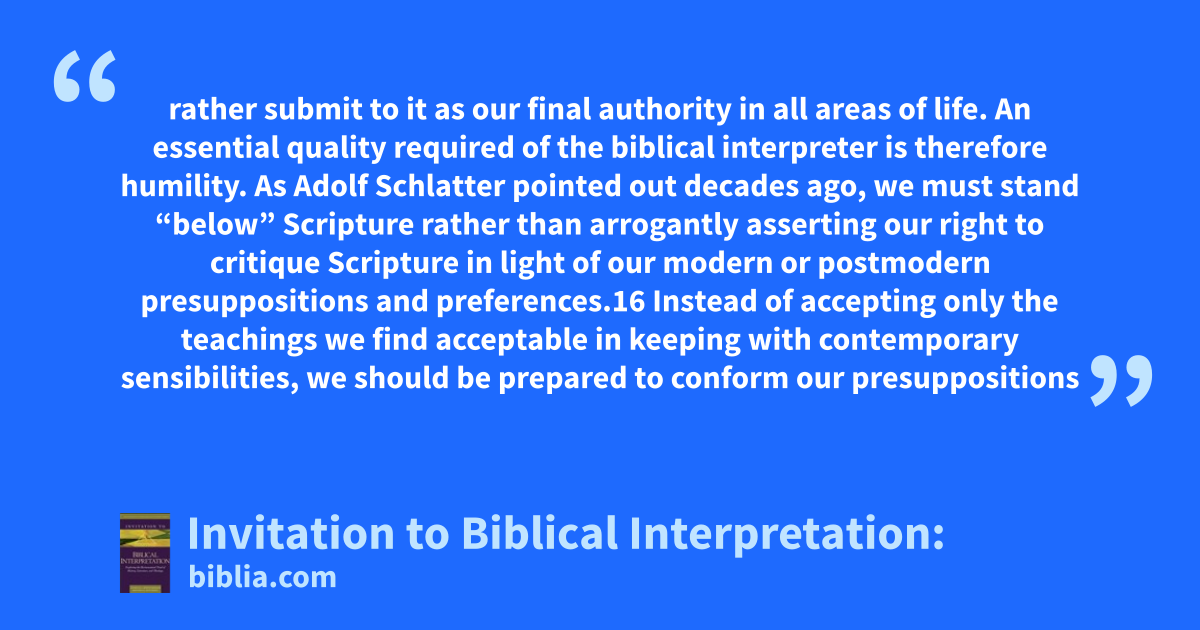 rather submit to it as our final authority in all areas of life. An essential quality required of the biblical interpreter is therefore humility. As Adolf Schlatter pointed out decades ago, we must stand “below” Scripture rather than arrogantly asserting our right to critique Scripture in light of our modern or postmodern presuppositions and preferences.16 Instead of accepting only the teachings we find acceptable in keeping with contemporary sensibilities, we should be prepared to conform our presuppositions