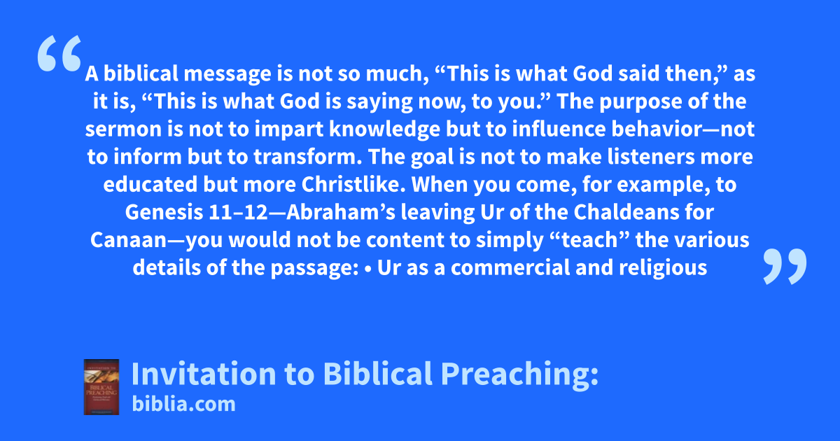 A biblical message is not so much, “This is what God said then,” as it is, “This is what God is saying now, to you.” The purpose of the sermon is not to impart knowledge but to influence behavior—not to inform but to transform. The goal is not to make listeners more educated but more Christlike. When you come, for example, to Genesis 11–12—Abraham’s leaving Ur of the Chaldeans for Canaan—you would not be content to simply “teach” the various details of the passage: • Ur as a commercial and religious