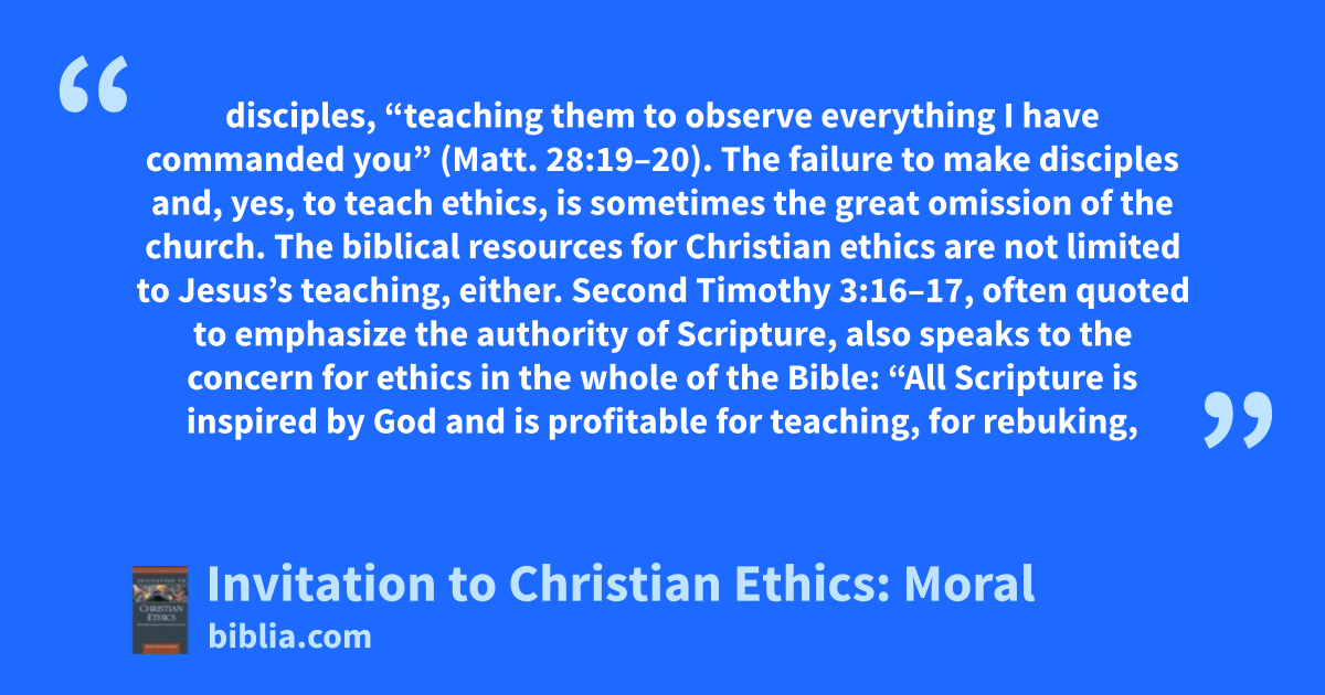 disciples, “teaching them to observe everything I have commanded you” (Matt. 28:19–20). The failure to make disciples and, yes, to teach ethics, is sometimes the great omission of the church. The biblical resources for Christian ethics are not limited to Jesus’s teaching, either. Second Timothy 3:16–17, often quoted to emphasize the authority of Scripture, also speaks to the concern for ethics in the whole of the Bible: “All Scripture is inspired by God and is profitable for teaching, for rebuking,