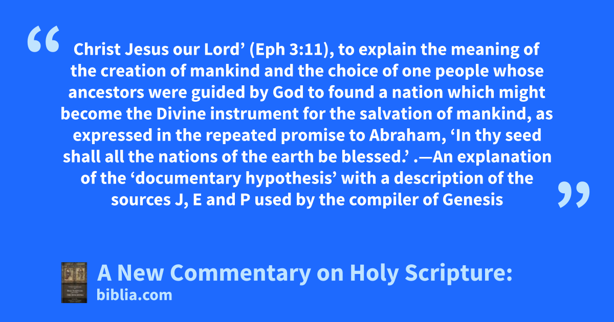 Christ Jesus our Lord’ (Eph 3:11), to explain the meaning of the creation of mankind and the choice of one people whose ancestors were guided by God to found a nation which might become the Divine instrument for the salvation of mankind, as expressed in the repeated promise to Abraham, ‘In thy seed shall all the nations of the earth be blessed.’ .—An explanation of the ‘documentary hypothesis’ with a description of the sources J, E and P used by the compiler of Genesis