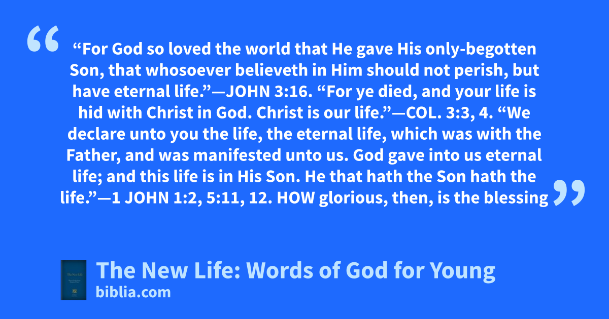 “For God so loved the world that He gave His only-begotten Son, that whosoever believeth in Him should not perish, but have eternal life.”—JOHN 3:16. “For ye died, and your life is hid with Christ in God. Christ is our life.”—COL. 3:3, 4. “We declare unto you the life, the eternal life, which was with the Father, and was manifested unto us. God gave into us eternal life; and this life is in His Son. He that hath the Son hath the life.”—1 JOHN 1:2, 5:11, 12. HOW glorious, then, is the blessing