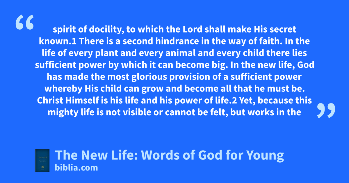 spirit of docility, to which the Lord shall make His secret known.1 There is a second hindrance in the way of faith. In the life of every plant and every animal and every child there lies sufficient power by which it can become big. In the new life, God has made the most glorious provision of a sufficient power whereby His child can grow and become all that he must be. Christ Himself is his life and his power of life.2 Yet, because this mighty life is not visible or cannot be felt, but works in the