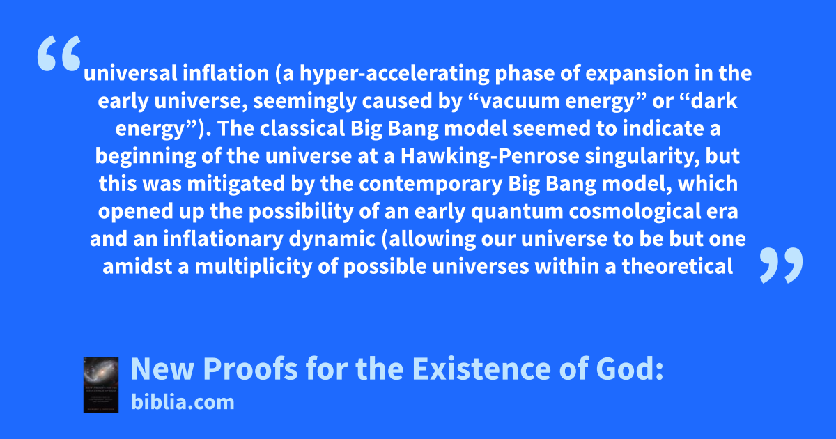 universal inflation (a hyper-accelerating phase of expansion in the early universe, seemingly caused by “vacuum energy” or “dark energy”). The classical Big Bang model seemed to indicate a beginning of the universe at a Hawking-Penrose singularity, but this was mitigated by the contemporary Big Bang model, which opened up the possibility of an early quantum cosmological era and an inflationary dynamic (allowing our universe to be but one amidst a multiplicity of possible universes within a theoretical