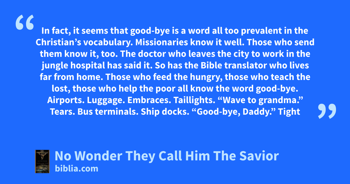 In fact, it seems that good-bye is a word all too prevalent in the Christian’s vocabulary. Missionaries know it well. Those who send them know it, too. The doctor who leaves the city to work in the jungle hospital has said it. So has the Bible translator who lives far from home. Those who feed the hungry, those who teach the lost, those who help the poor all know the word good-bye. Airports. Luggage. Embraces. Taillights. “Wave to grandma.” Tears. Bus terminals. Ship docks. “Good-bye, Daddy.” Tight