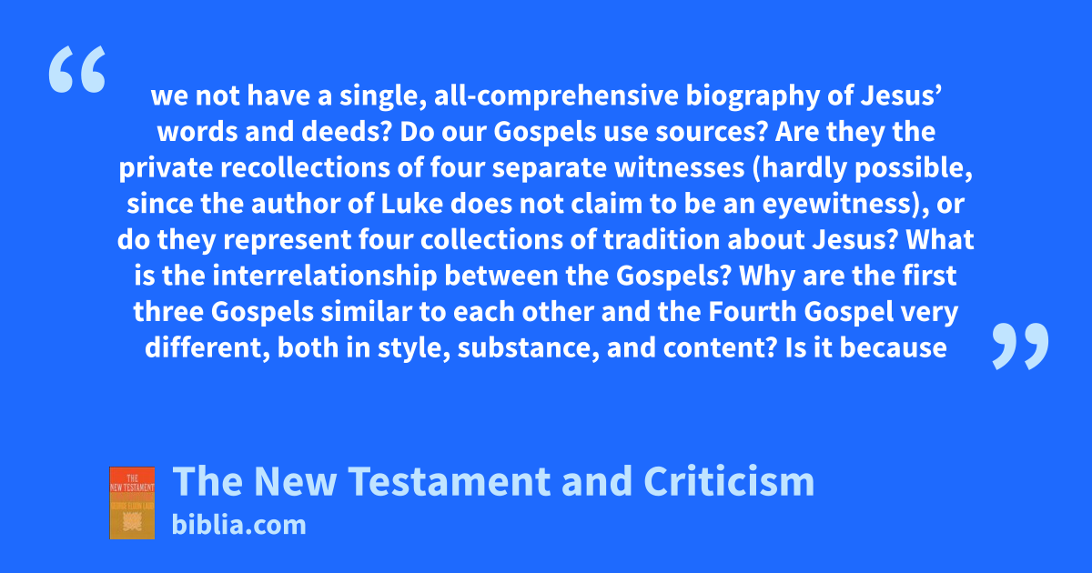 we not have a single, all-comprehensive biography of Jesus’ words and deeds? Do our Gospels use sources? Are they the private recollections of four separate witnesses (hardly possible, since the author of Luke does not claim to be an eyewitness), or do they represent four collections of tradition about Jesus? What is the interrelationship between the Gospels? Why are the first three Gospels similar to each other and the Fourth Gospel very different, both in style, substance, and content? Is it because