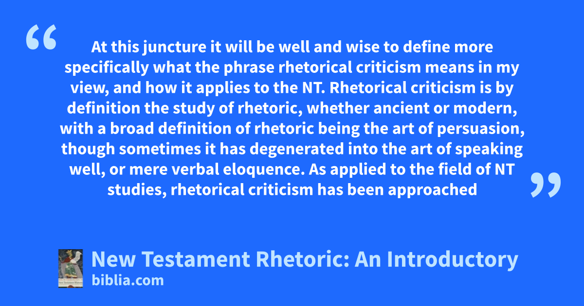 At this juncture it will be well and wise to define more specifically what the phrase rhetorical criticism means in my view, and how it applies to the NT. Rhetorical criticism is by definition the study of rhetoric, whether ancient or modern, with a broad definition of rhetoric being the art of persuasion, though sometimes it has degenerated into the art of speaking well, or mere verbal eloquence. As applied to the field of NT studies, rhetorical criticism has been approached