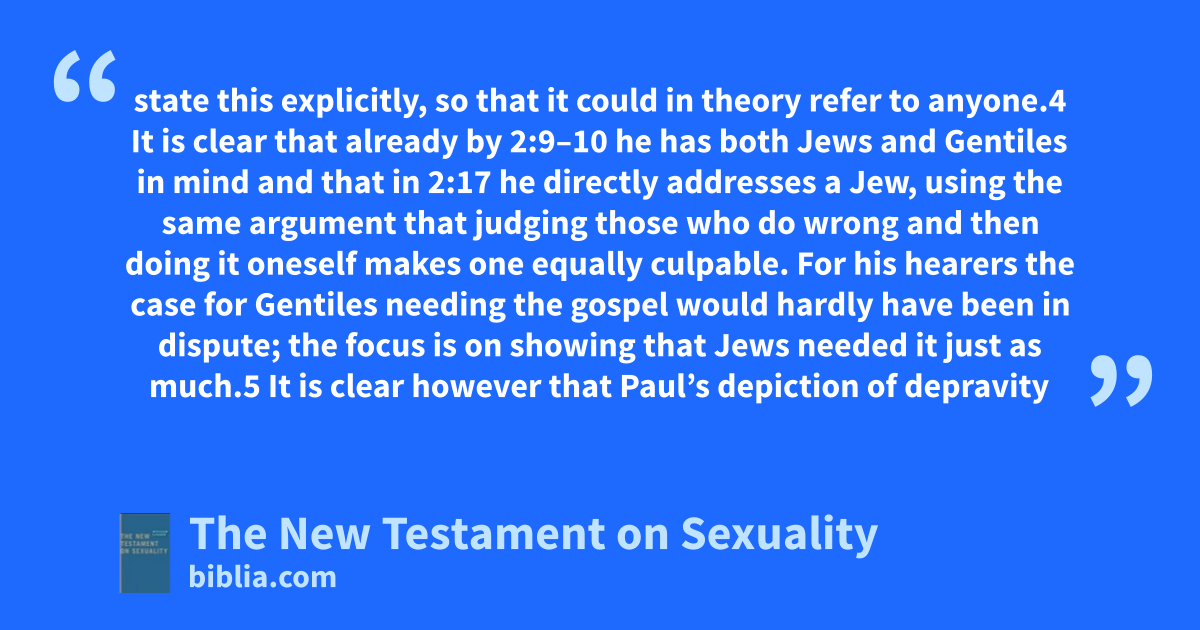 state this explicitly, so that it could in theory refer to anyone.4 It is clear that already by 2:9–10 he has both Jews and Gentiles in mind and that in 2:17 he directly addresses a Jew, using the same argument that judging those who do wrong and then doing it oneself makes one equally culpable. For his hearers the case for Gentiles needing the gospel would hardly have been in dispute; the focus is on showing that Jews needed it just as much.5 It is clear however that Paul’s depiction of depravity