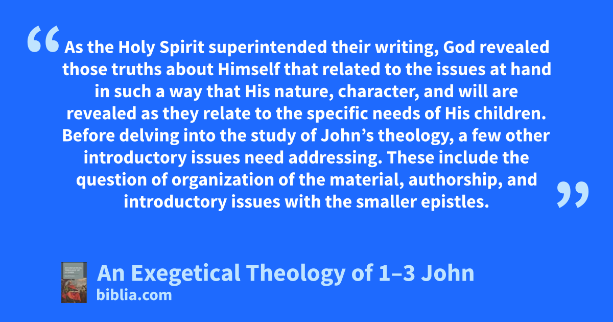 As the Holy Spirit superintended their writing, God revealed those truths about Himself that related to the issues at hand in such a way that His nature, character, and will are revealed as they relate to the specific needs of His children. Before delving into the study of John’s theology, a few other introductory issues need addressing. These include the question of organization of the material, authorship, and introductory issues with the smaller epistles.
