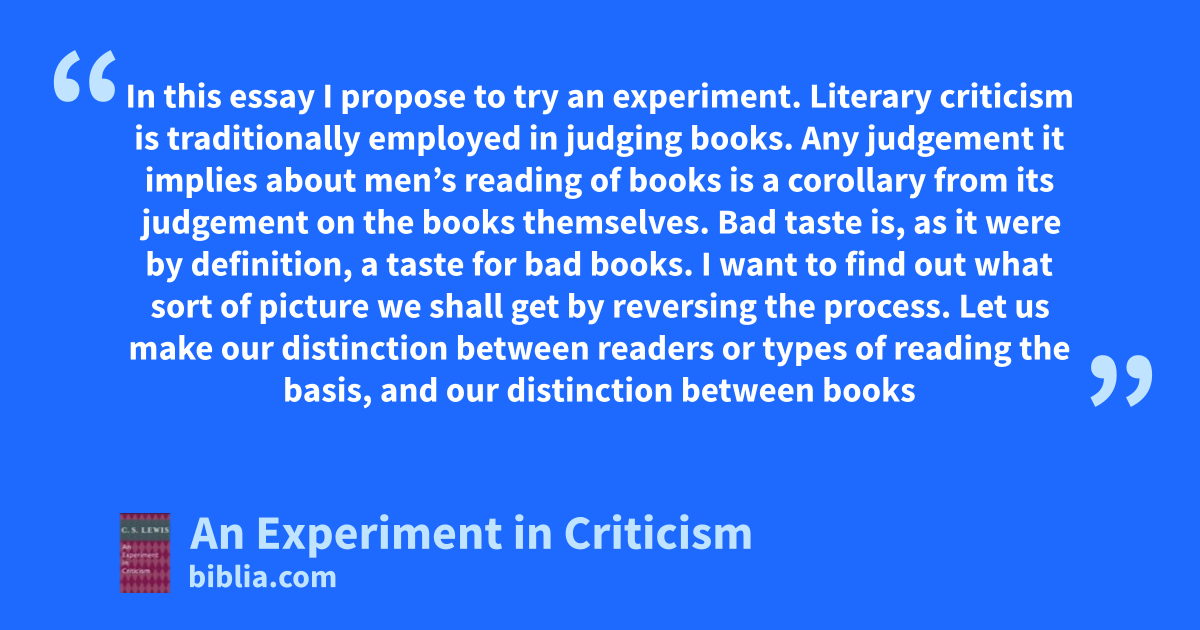 In this essay I propose to try an experiment. Literary criticism is traditionally employed in judging books. Any judgement it implies about men’s reading of books is a corollary from its judgement on the books themselves. Bad taste is, as it were by definition, a taste for bad books. I want to find out what sort of picture we shall get by reversing the process. Let us make our distinction between readers or types of reading the basis, and our distinction between books