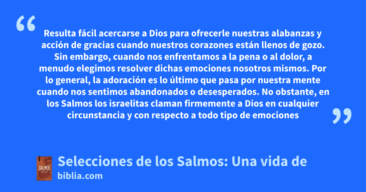 ¿A quién acudes en buenos y malos tiempos? En los Salmos, encontramos gente de la antigüedad adorando a Dios en todo tipo de situaciones: alabanza, gratitud, ira, frustración, y tristeza. Los Salmos reflejan una adoración genuina y nos animan a acudir a Dios en cualquier situación.