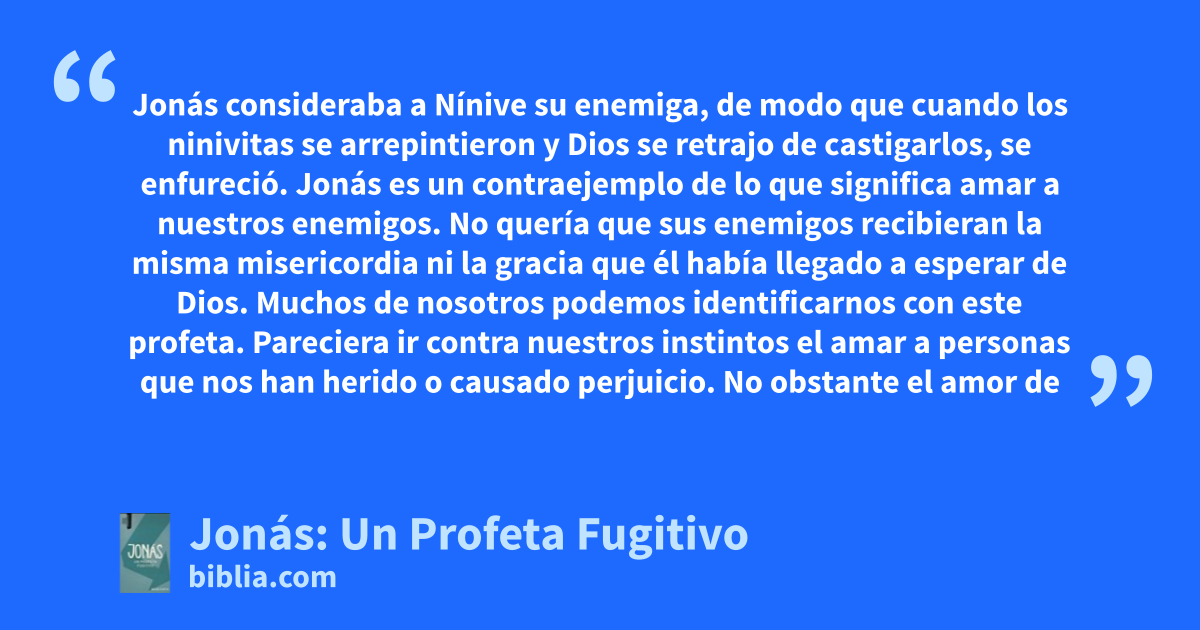 Jonás consideraba a Nínive su enemiga, de modo que cuando los ninivitas se arrepintieron y Dios se retrajo de castigarlos, se enfureció. Jonás es un contraejemplo de lo que significa amar a nuestros enemigos. No quería que sus enemigos recibieran la misma misericordia ni la gracia que él había llegado a esperar de Dios. Muchos de nosotros podemos identificarnos con este profeta. Pareciera ir contra nuestros instintos el amar a personas que nos han herido o causado perjuicio. No obstante el amor de