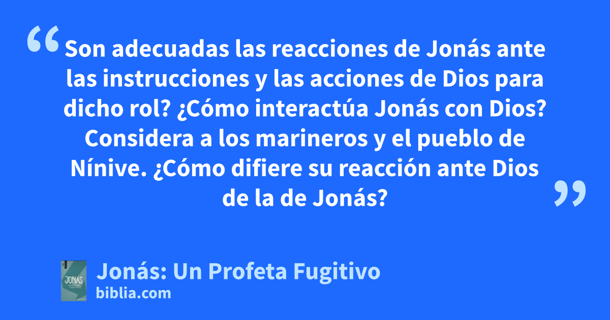 Son adecuadas las reacciones de Jonás ante las instrucciones y las acciones de Dios para dicho rol? ¿Cómo interactúa Jonás con Dios? Considera a los marineros y el pueblo de Nínive. ¿Cómo difiere su reacción ante Dios de la de Jonás?