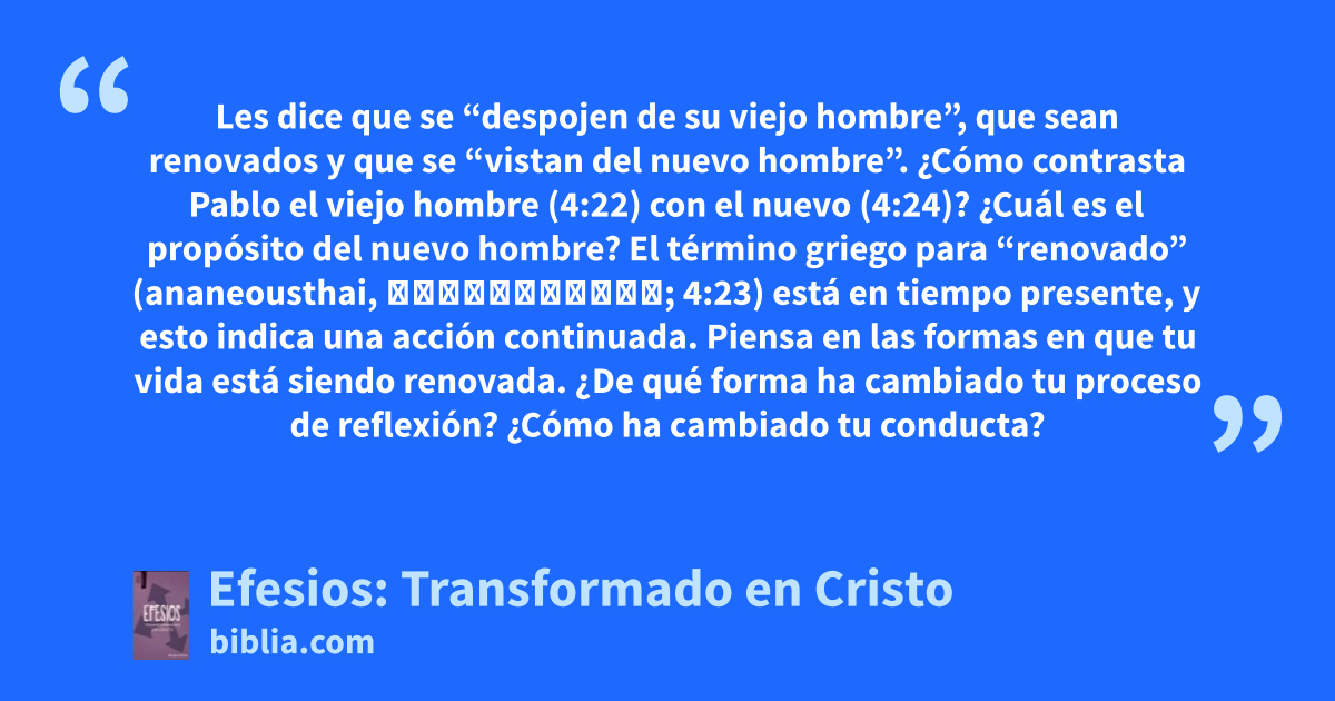 Les dice que se “despojen de su viejo hombre”, que sean renovados y que se “vistan del nuevo hombre”. ¿Cómo contrasta Pablo el viejo hombre (4:22) con el nuevo (4:24)? ¿Cuál es el propósito del nuevo hombre? El término griego para “renovado” (ananeousthai, ἀνανεοῦσθαι; 4:23) está en tiempo presente, y esto indica una acción continuada. Piensa en las formas en que tu vida está siendo renovada. ¿De qué forma ha cambiado tu proceso de reflexión? ¿Cómo ha cambiado tu conducta?