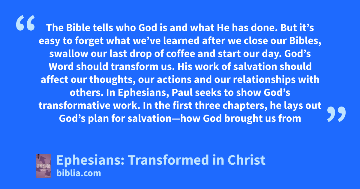 The Bible tells who God is and what He has done. But it’s easy to forget what we’ve learned after we close our Bibles, swallow our last drop of coffee and start our day. God’s Word should transform us. His work of salvation should affect our thoughts, our actions and our relationships with others. In Ephesians, Paul seeks to show God’s transformative work. In the first three chapters, he lays out God’s plan for salvation—how God brought us from