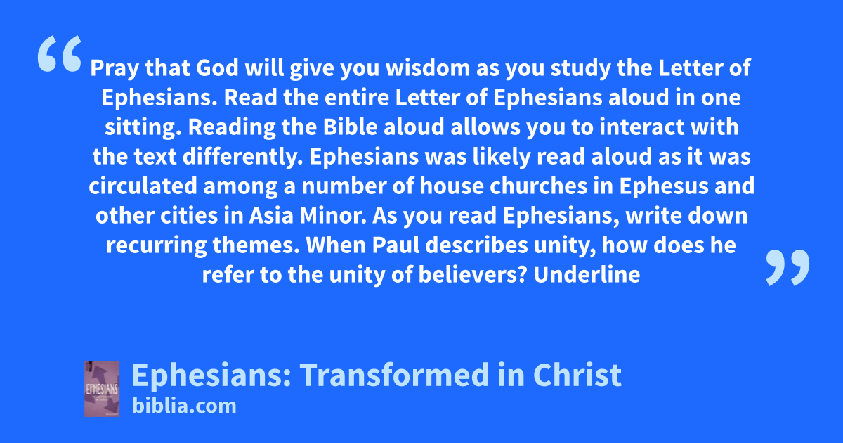 Pray that God will give you wisdom as you study the Letter of Ephesians. Read the entire Letter of Ephesians aloud in one sitting. Reading the Bible aloud allows you to interact with the text differently. Ephesians was likely read aloud as it was circulated among a number of house churches in Ephesus and other cities in Asia Minor. As you read Ephesians, write down recurring themes. When Paul describes unity, how does he refer to the unity of believers? Underline