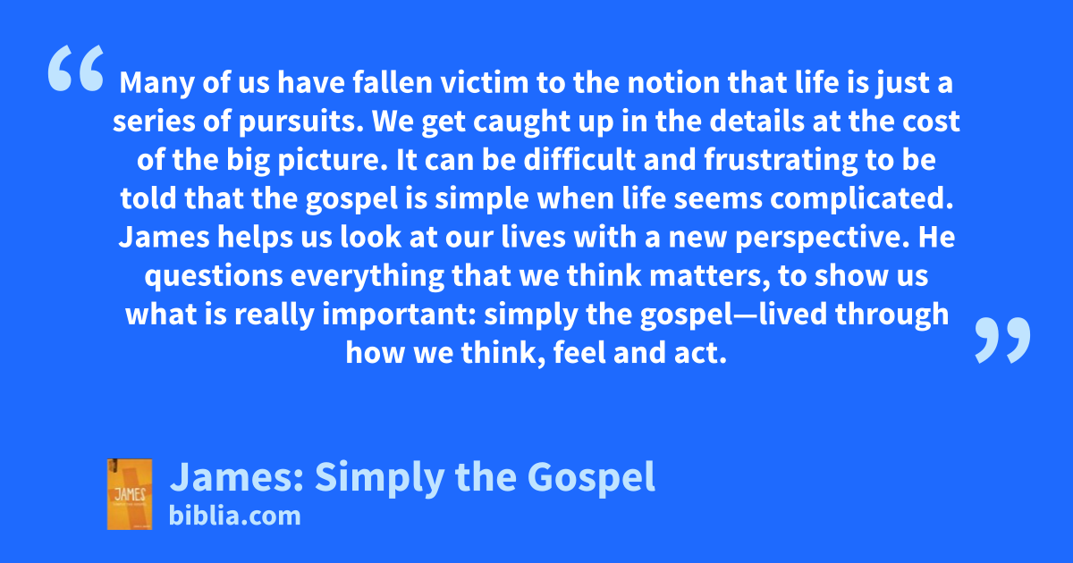 Many of us have fallen victim to the notion that life is just a series of pursuits. We get caught up in the details at the cost of the big picture. It can be difficult and frustrating to be told that the gospel is simple when life seems complicated. James helps us look at our lives with a new perspective. He questions everything that we think matters, to show us what is really important: simply the gospel—lived through how we think, feel and act.
