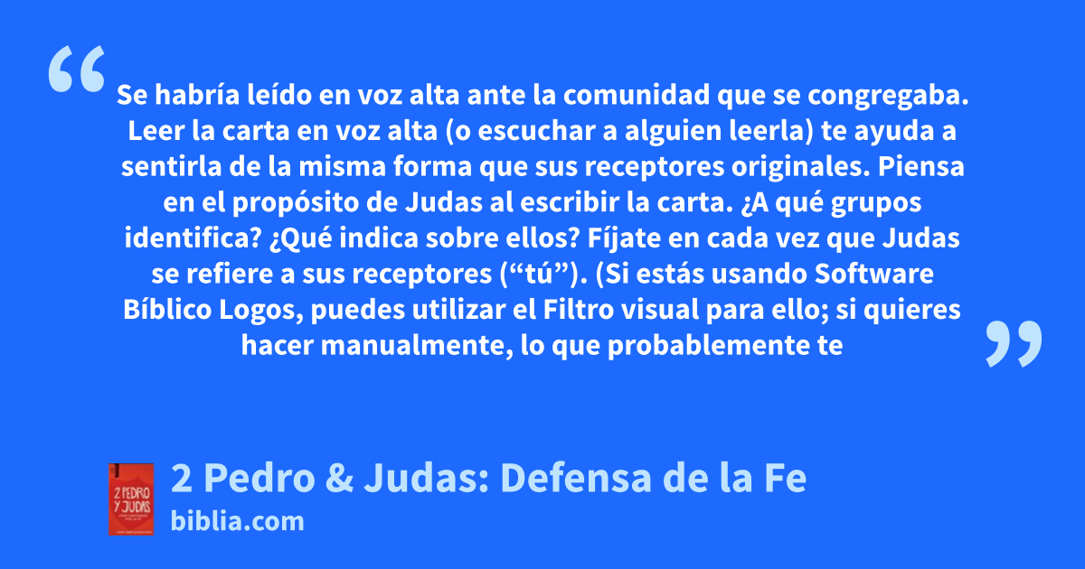 Se habría leído en voz alta ante la comunidad que se congregaba. Leer la carta en voz alta (o escuchar a alguien leerla) te ayuda a sentirla de la misma forma que sus receptores originales. Piensa en el propósito de Judas al escribir la carta. ¿A qué grupos identifica? ¿Qué indica sobre ellos? Fíjate en cada vez que Judas se refiere a sus receptores (“tú”). (Si estás usando Software Bíblico Logos, puedes utilizar el Filtro visual para ello; si quieres hacer manualmente, lo que probablemente te