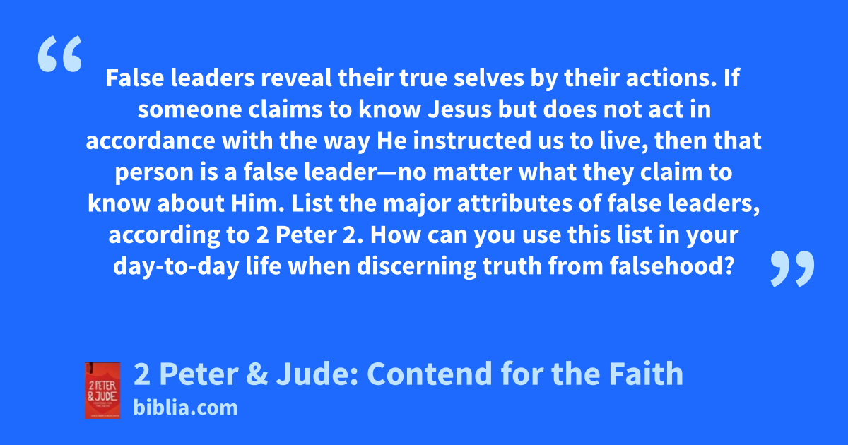 False leaders reveal their true selves by their actions. If someone claims to know Jesus but does not act in accordance with the way He instructed us to live, then that person is a false leader—no matter what they claim to know about Him. List the major attributes of false leaders, according to 2 Peter 2. How can you use this list in your day-to-day life when discerning truth from falsehood?