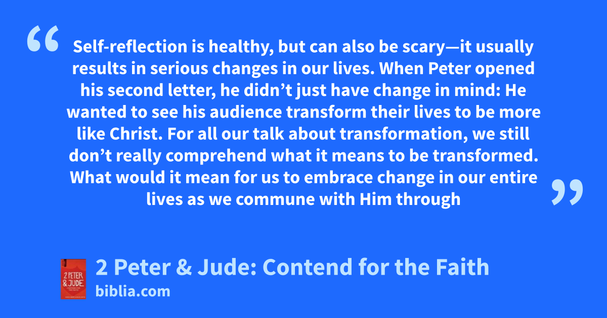 Self-reflection is healthy, but can also be scary—it usually results in serious changes in our lives. When Peter opened his second letter, he didn’t just have change in mind: He wanted to see his audience transform their lives to be more like Christ. For all our talk about transformation, we still don’t really comprehend what it means to be transformed. What would it mean for us to embrace change in our entire lives as we commune with Him through